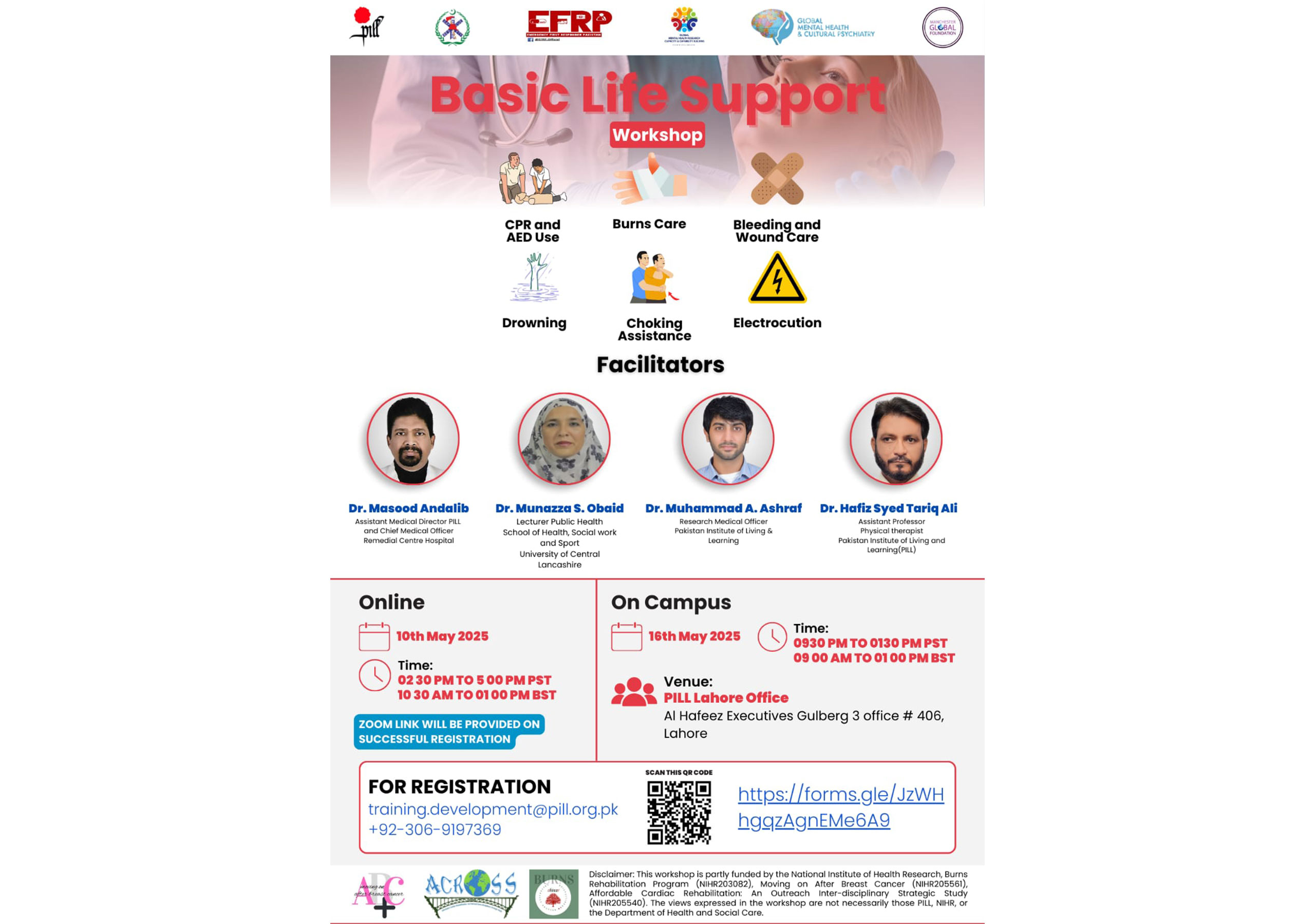 The Basic Life Support Workshop, organised by the Pakistan Institute of Living and Learning (PILL) in collaboration with various health organizations, covers essential life-saving topics such as CPR and AED use, burns care, bleeding and wound care, drowning, choking assistance, and electrocution.